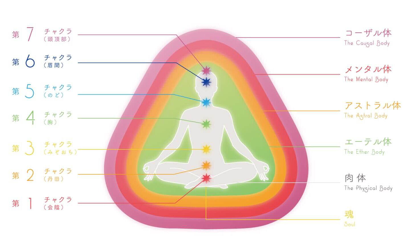 肉体の周りにエーテル体(気)、アストラル体(感情)、メンタル体(精神・思考)、コーザル体(信仰)と呼ばれるエネルギー体があります。